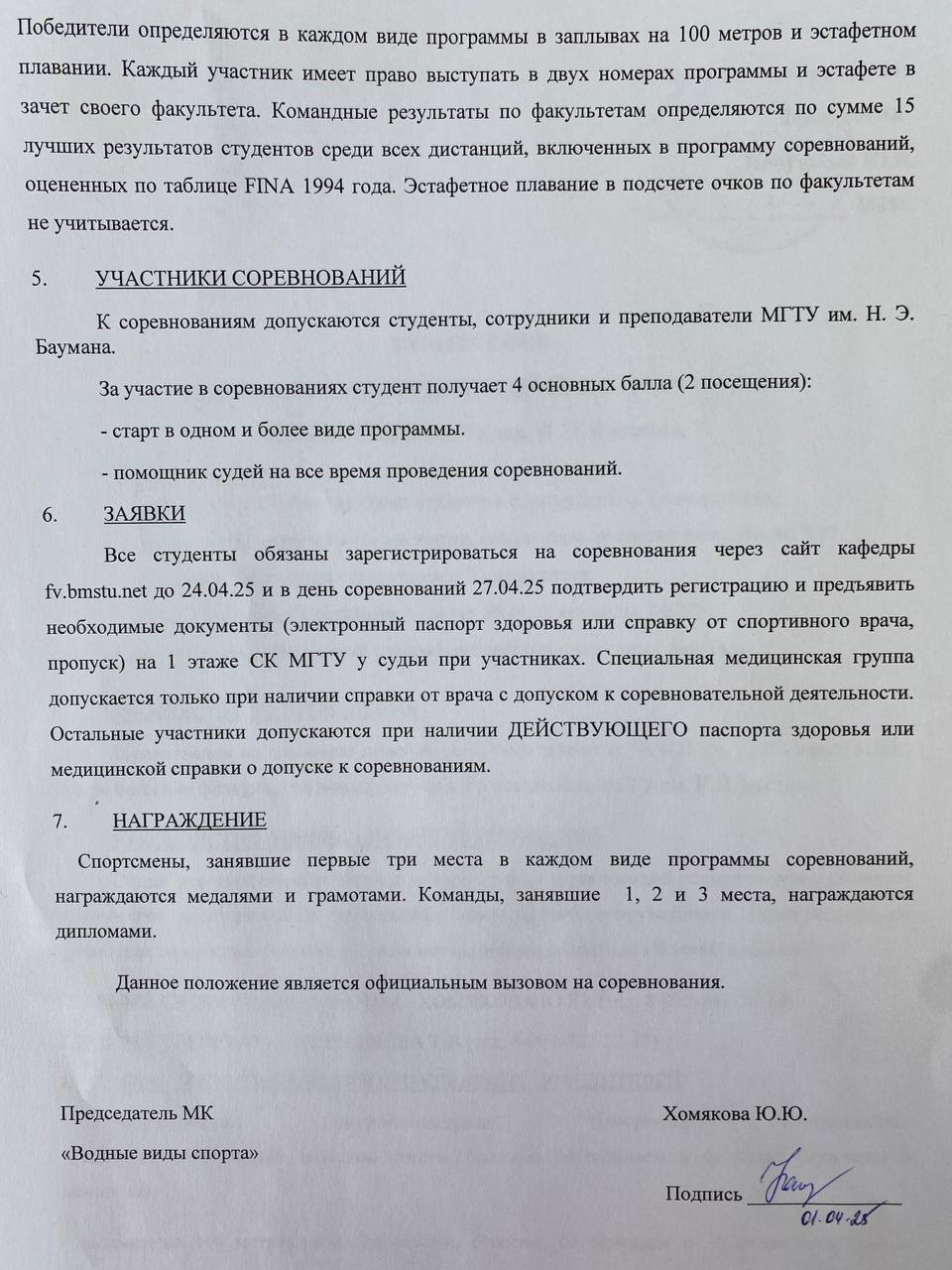 27.04.25 в бассейне СК МГТУ состоятся соревнования по плаванию. Всем студентам необходимо до 24.04.25 отправить заявку на участие в соревнованиях по ссылке.